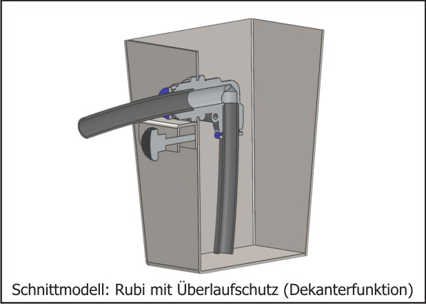 Der integrierte Überlaufschutz verhindert das Überlaufen des Behälters. Sollte der Rubi nicht entleert werden, wird über seine Dekanterfunktion der Überschuss in die Maschine zurückgeführt. Das Entleeren des Rubis ist durch seine ausgeklügelte Bauform sehr schnell und einfach. Eine einfache und schnelle Befestigung ist über Einhängen an der Maschine möglich - ohne Bohren und Schrauben.